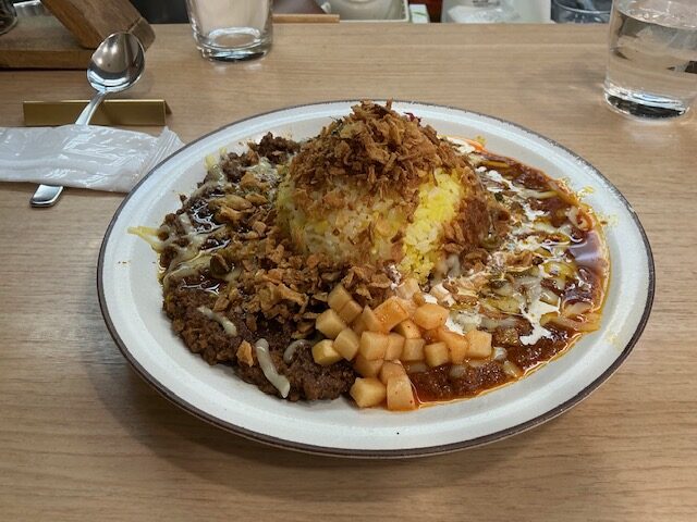 欲張りなのでオーダーは二種盛で、バターチキンとマトンキーマのカレーにチーズをトッピングして辛口にしてみました。店主が女性ということで、見た目とは裏腹にお子様でもいただけるようなとてもマイルドなカレーに仕上がっていました。あらかじめ添えられているいろいろな野菜の付け合わせとカレーのコラボレーションが素晴らしく、非常に完成度が高いカレーだと思い嬉しい気分になりました。次回は残る一種類のひよこ豆カレーをいただきに伺いたいと思っております。思わぬところで自分史上に残る美味しいカレーと出会うことが出来ました。(評価5.00点/5.00点)