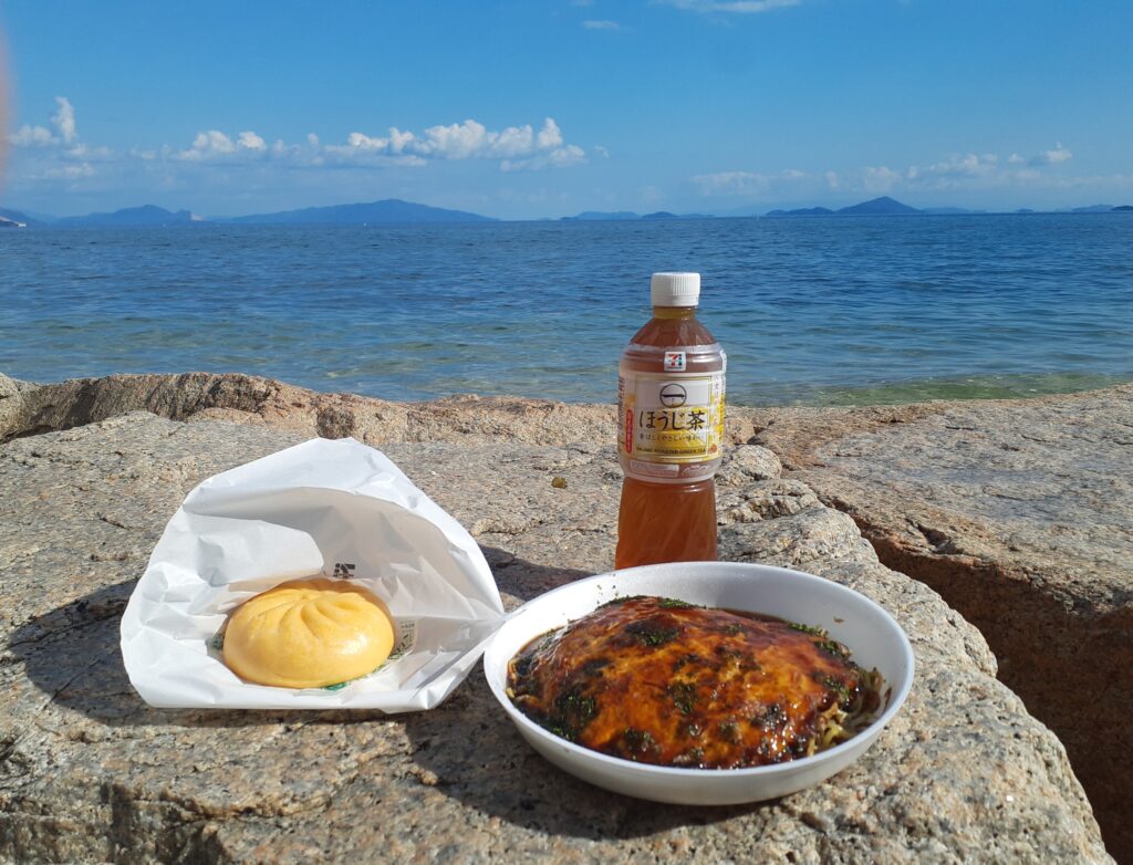 晴れ渡った秋空の下、海を見ながらのランチは格別でございます。岩国市の海沿いを走る国道188号線沿いにある『えびす亭』さんでお好み焼きをテイクアウトして、セブンのお茶とピザまんでランチしました。(評価4.50点/5.00点)