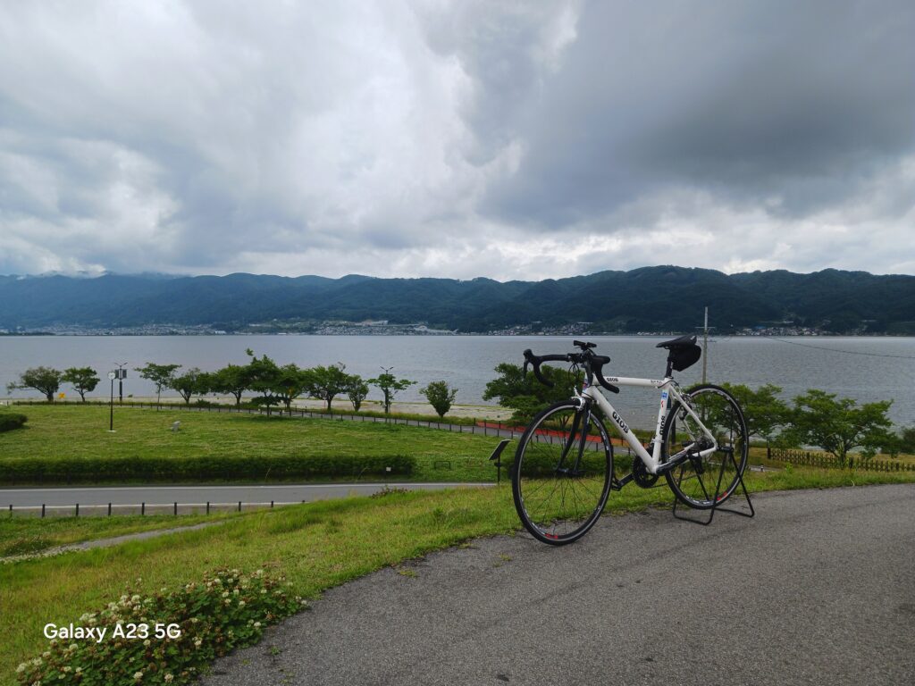 お蕎麦をいただいた後、諏訪湖を目指しました。諏訪湖の周りにはたくさんの無料駐車場があって、観光客を優しく迎え入れていただいております。一周約16㎞のサイクリングロードは、完成したばかりということもあって、路面状態がとてもよく平坦なので、のんびりとサイクリングするにはもってこいの道です。