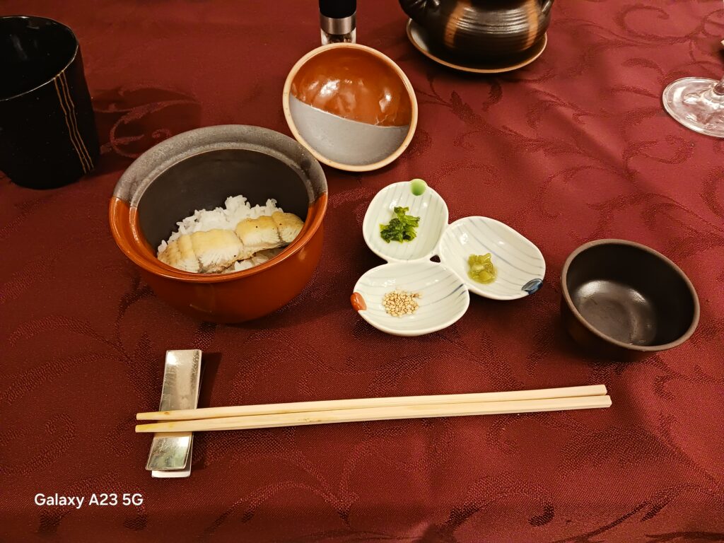 お食事はひつまぶし風のうなぎ白焼きご飯になります。薬味は刻み山葵、紫蘇の実、胡麻の三種類で鰹のお出汁でいただきました。白焼きでひつまぶしとは…驚きの美味しさでした。