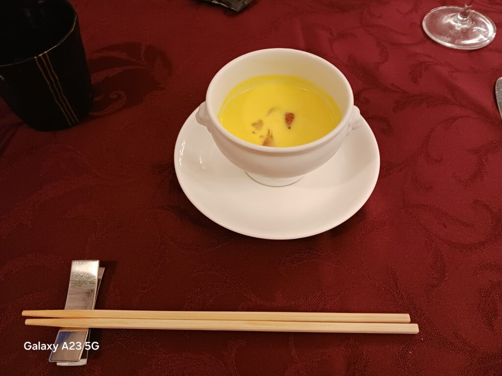 冷製パンプキンポタージュ コンソメジュレ添えになります。とても贅沢なお口直しをいただきました。