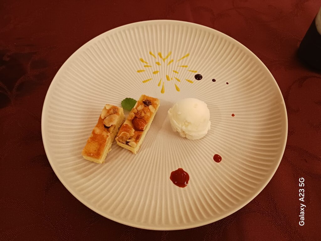 デザートは木の実のタルトとピーチのシャーベットになります。デザートまで完璧なコースをいただきました。お味はもちろんのこと見た目にも素晴らしいコース料理でした。またいつか必ずリピートしようと決意を固めた次第でございます。(評価5.00点/5.00点)