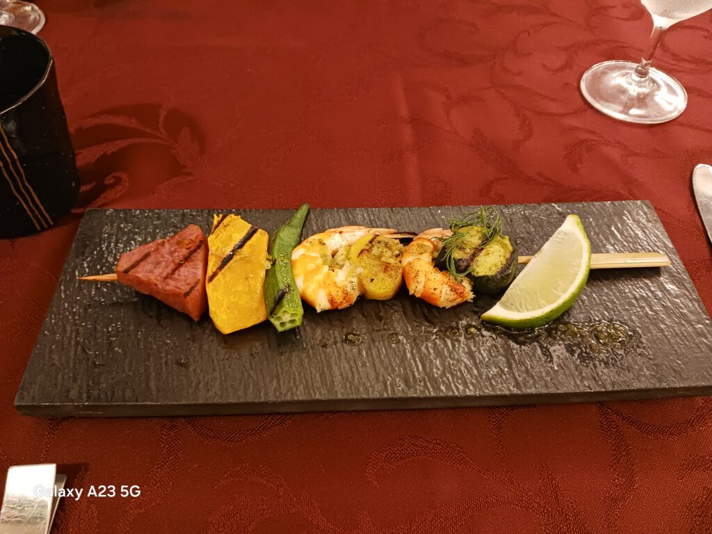 魚料理は、夏野菜と海老のスビエディーニ パセリとビネガーのソースになります。耳慣れない名前のお料理ですが、串焼のようなお料理です。振りかけられたソースが夏野菜のお味を引き立てていました。