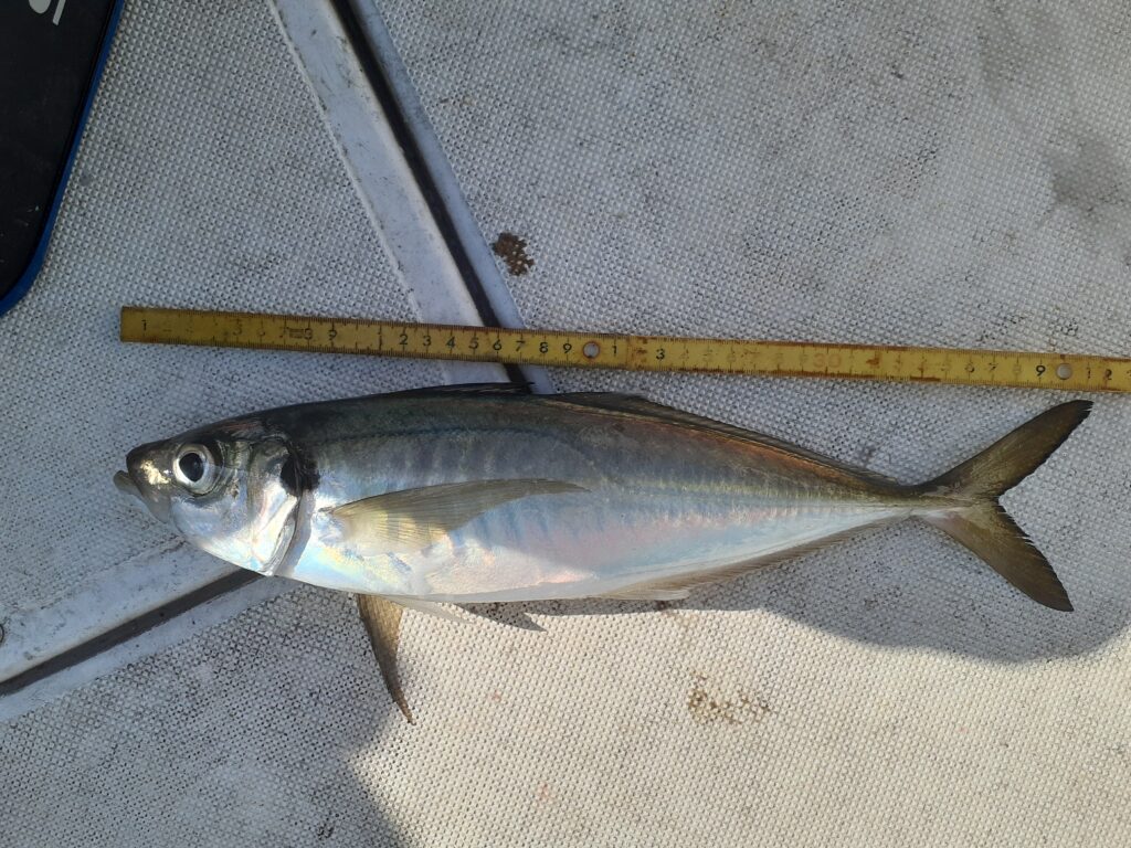 なかなか当たりが出ずに時間だけが過ぎて行ったのですが、突然、竿を叩くような大きなあたりが出ました。慎重にリールを巻くと40㎝オーバーの立派なアジ。それに続いてもう一匹47㎝の特大アジを釣り上げることが出来ました。